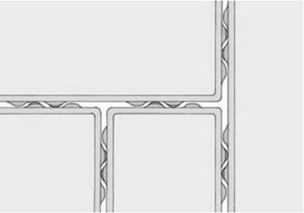 Die benachbarten Distanz-/Verbundelemente sind unterschiedlich ausgebildet. Ein Element hat durchgehend von knapp unter der Oberkante des Steins bis zur Unterkante die Stärke von 2,5 mm. Das benachbarte Distanz-/Verbundelement verdickt sich im unteren Bereich auf 4,5 mm. Die Steine werden somit zwangsweise mit einem Abstand von 4,5 mm verlegt – damit ist die Möglichkeit einer optimalen Einsandung gegeben. Besonders hervorzuheben ist dabei, dass die Einsandung auch in den Bereichen der Distanz-/Verbundelemente erfolgt. Das durchgehende Element hat einen Abstand zum Nachbarstein, das Resultat ist eine vollflächige Verfüllung. Das benachbarte Distanzelement – es liegt im unteren Bereich punktförmig am Nachbarstein an – wird ebenfalls oberhalb des Distanzpunktes mit Füllmaterial ummantelt, so dass ein Druckausgleich bei Belastung erfolgt. Ein weiterer wichtiger Effekt ist, dass das untere Distanz-/Verbundelement einen erhöhten Kraftschluss über die gesamte Fugenbreite von Stein zu Stein schafft.